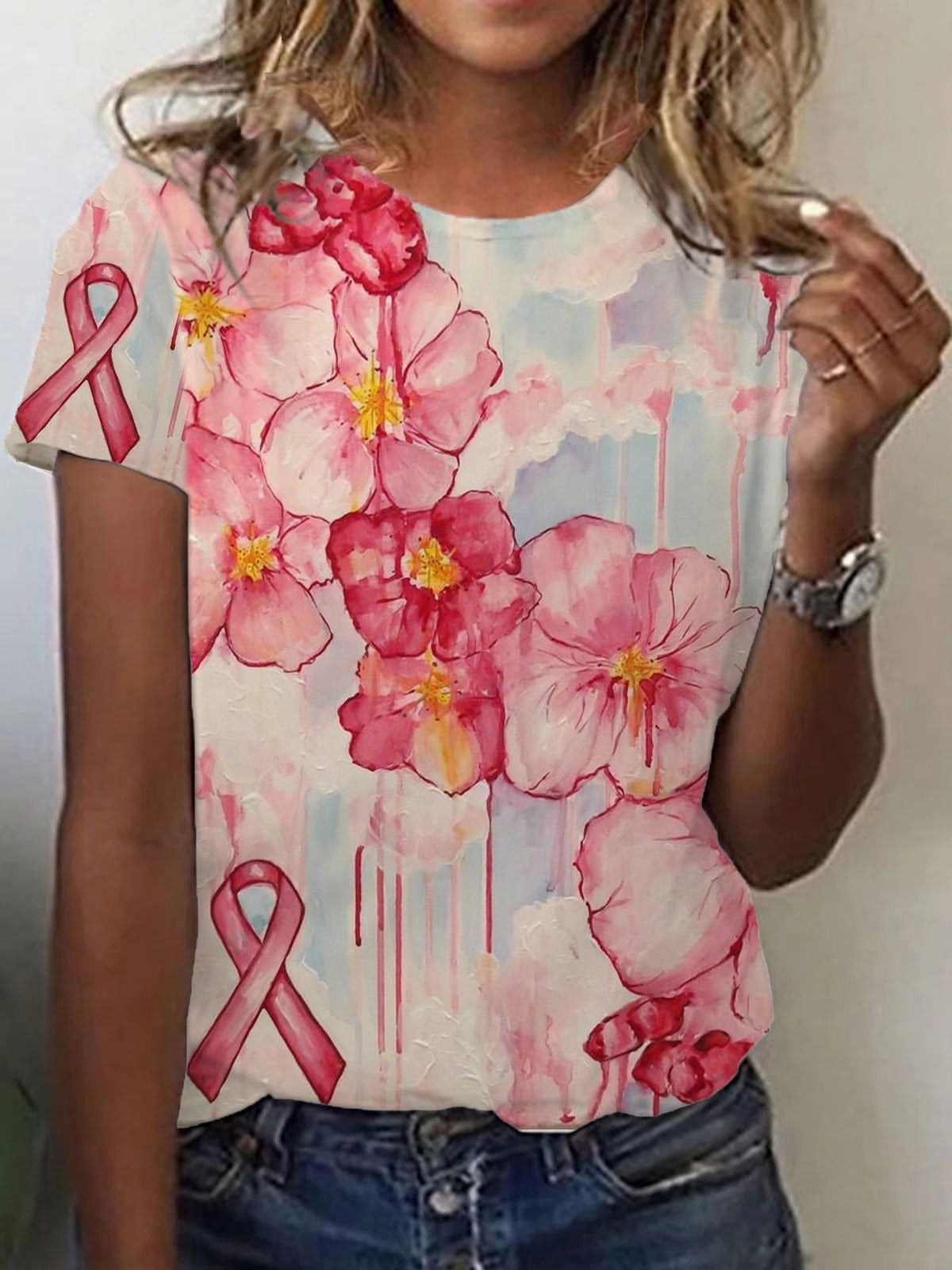 T-shirt à manches courtes imprimé fleurs du ruban rose cancer du sein pour femmes