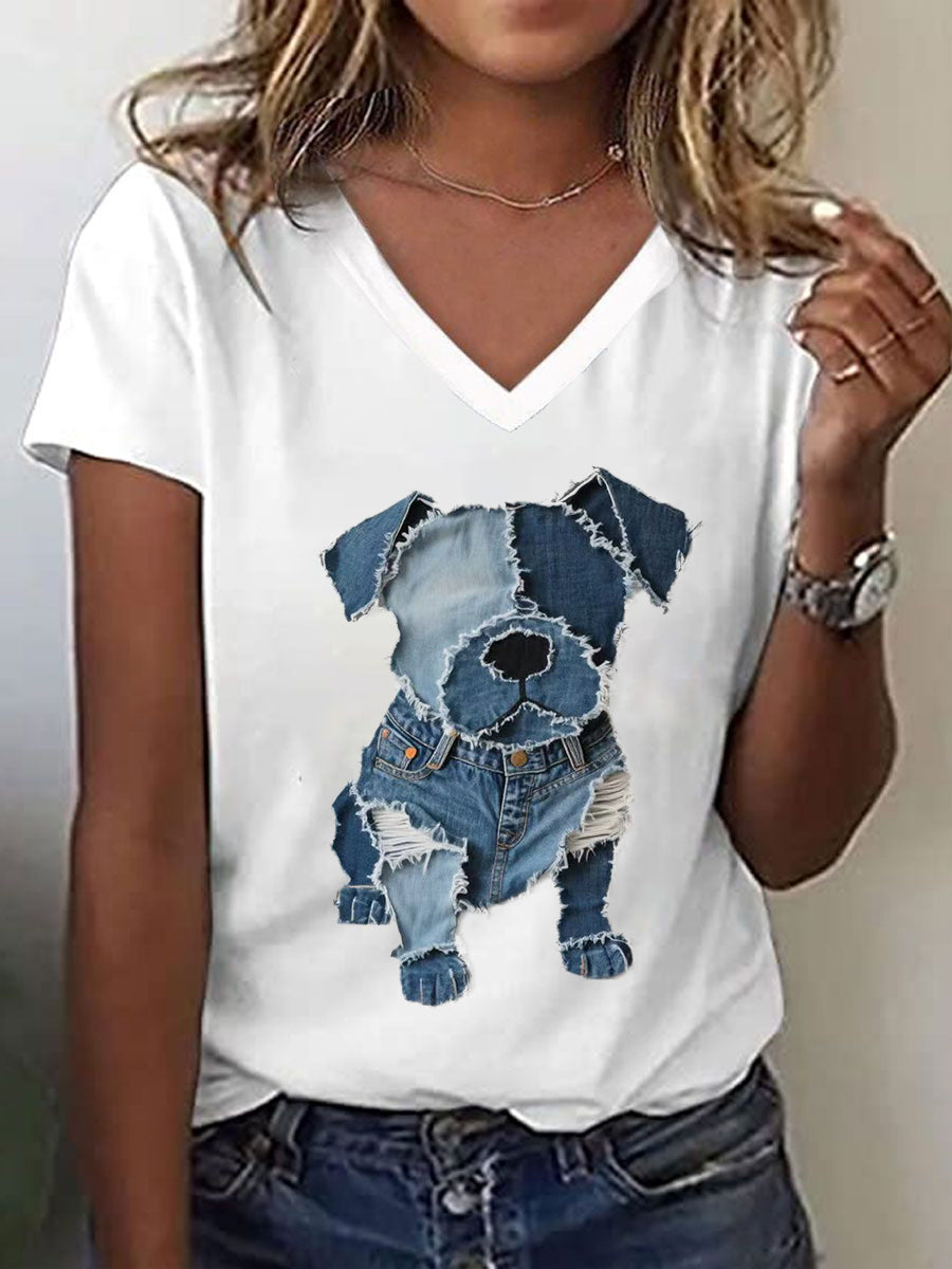 Modèle mignon de chien Patchwork Art V-Neck T-Shirt des femmes