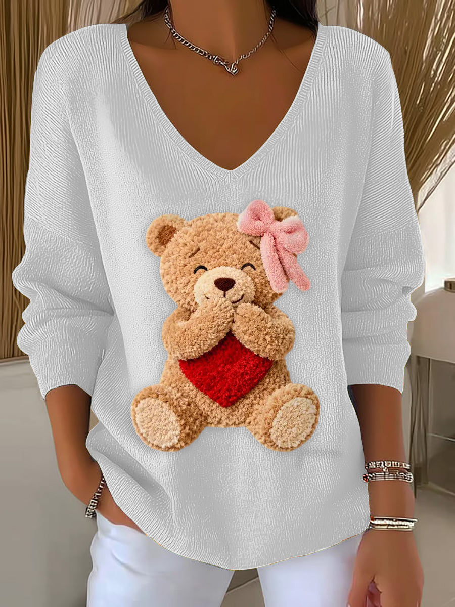 Femmes Mignon Ours Valentine V-Neck Côtelé Haut