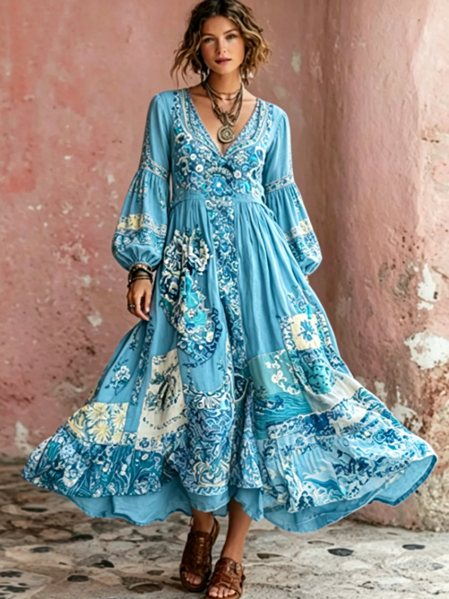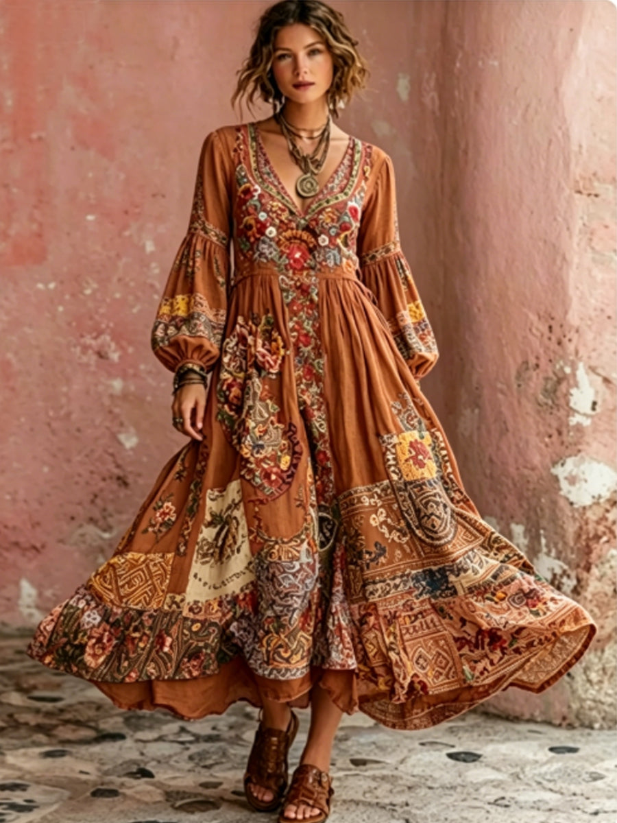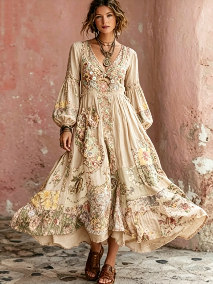 Robe mi-longue bohème pour femme, à col en V, manches courtes, avec broderie florale artistique