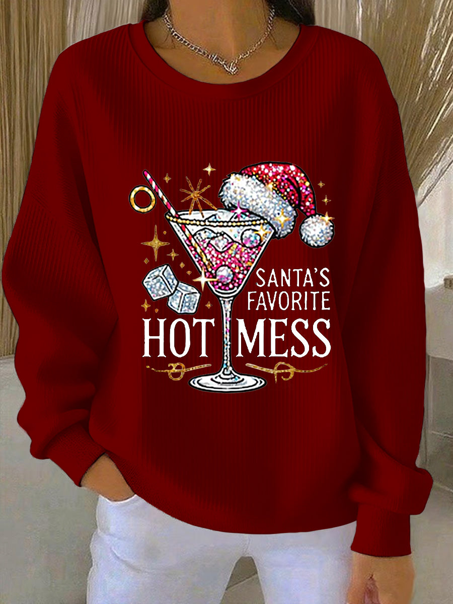Sweat-shirt décontracté côtelé imprimé Hot Mess préféré du Père Noël pour femmes