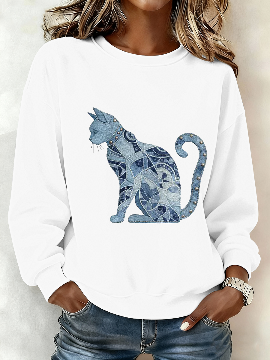 Sweat-shirt femme en polyester à imprimé patchwork chat vintage