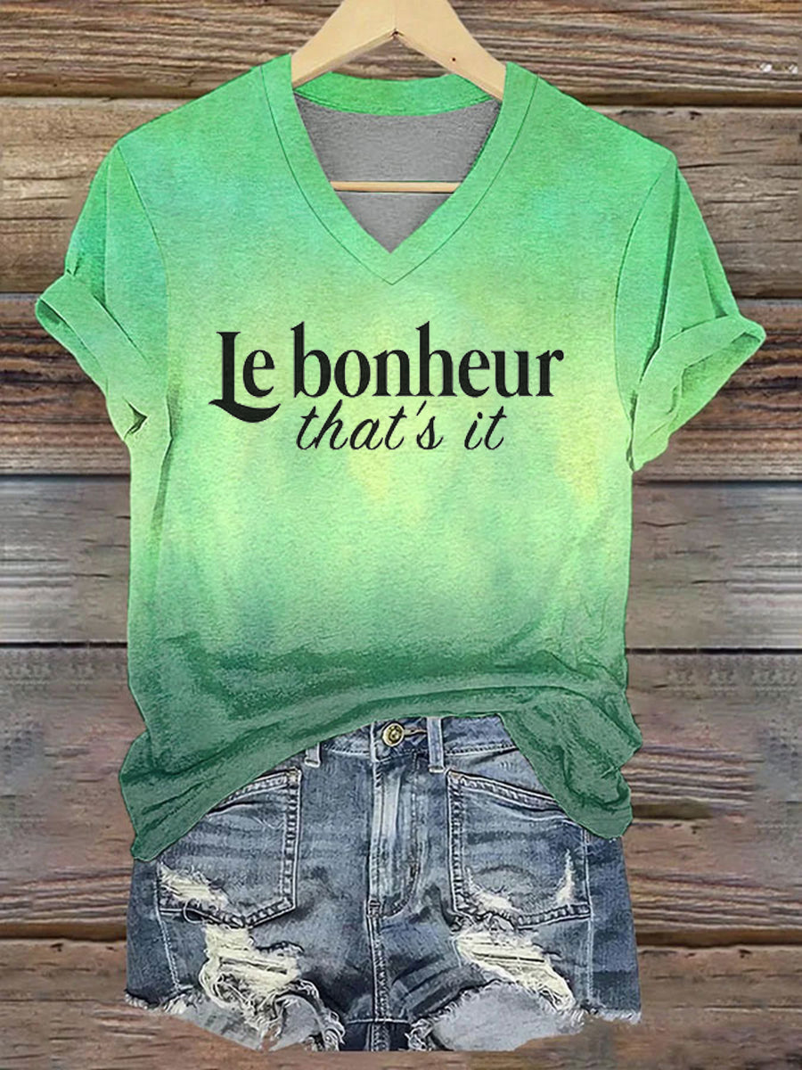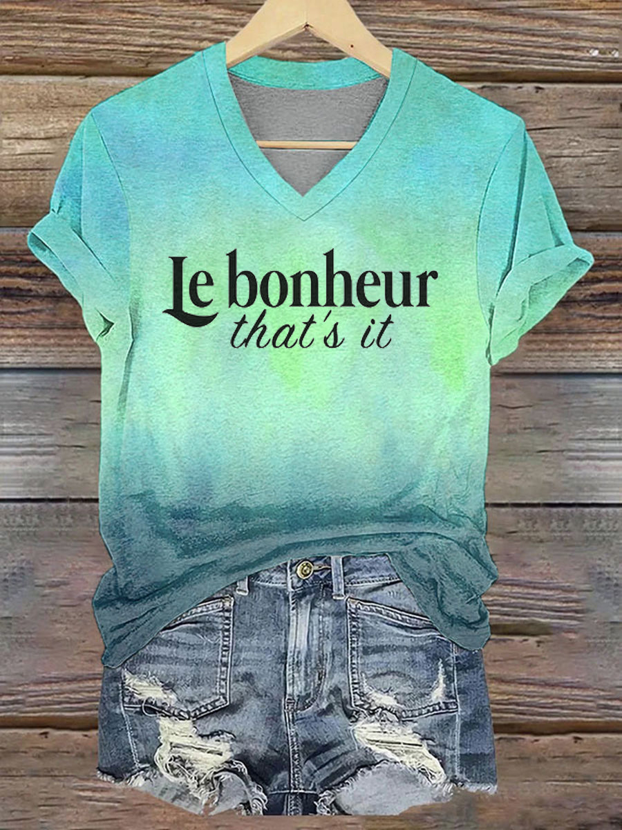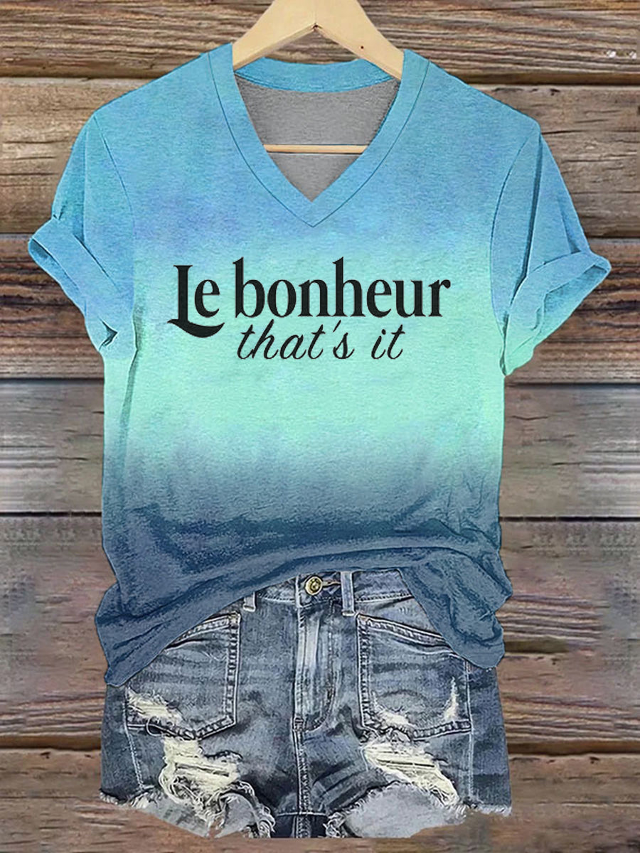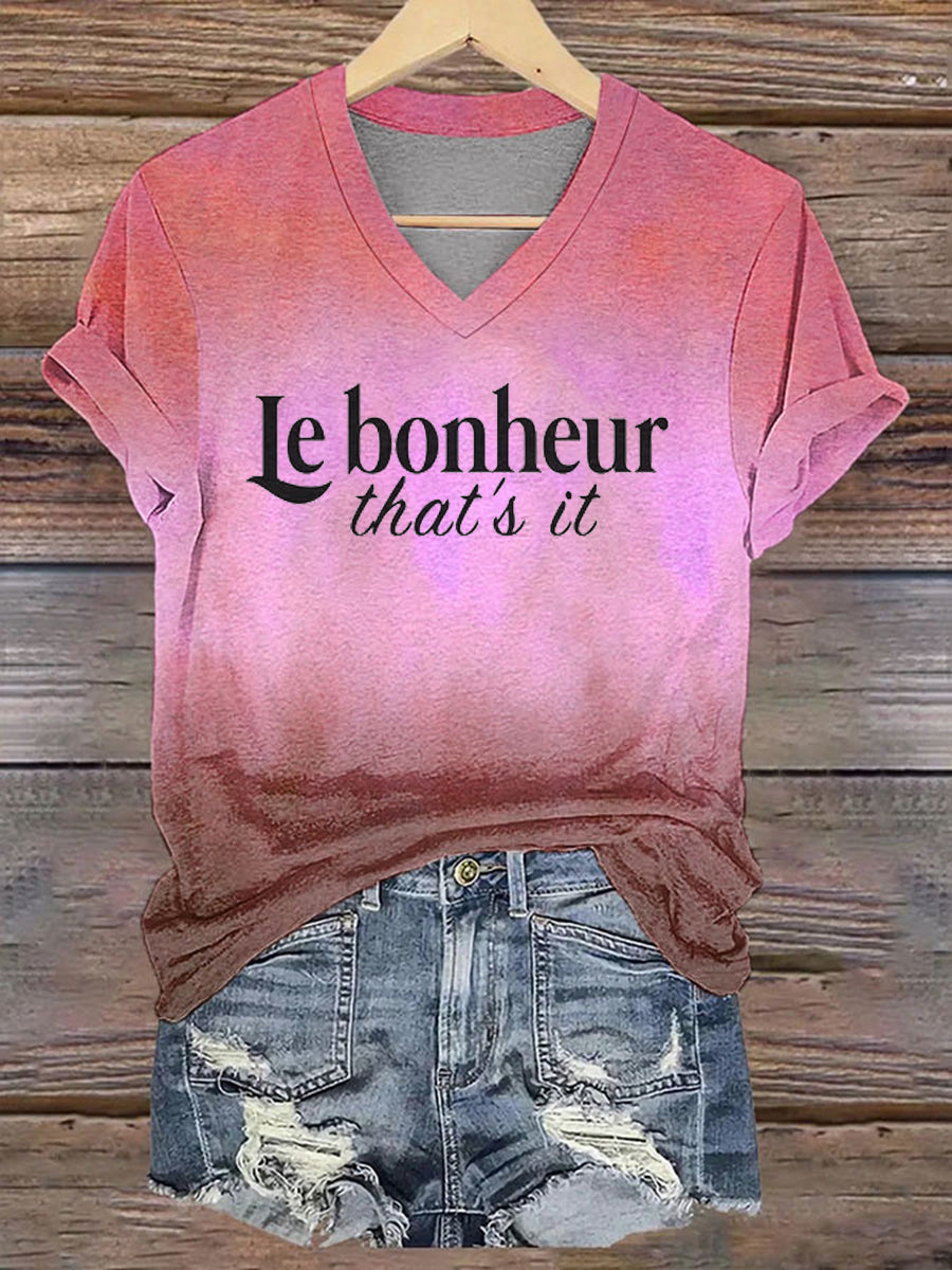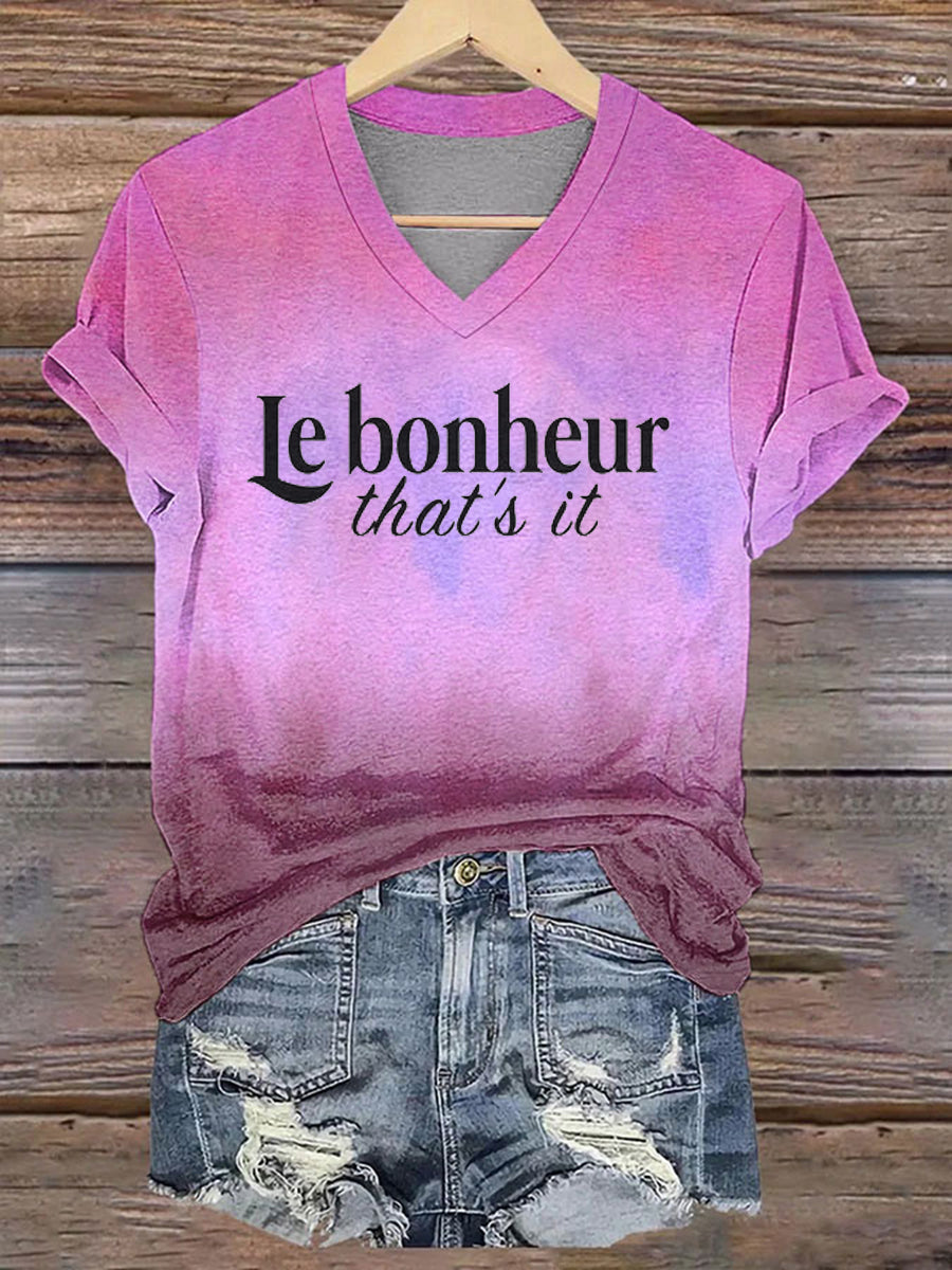 T-shirt à col en V imprimé Le bonheur c'est tout